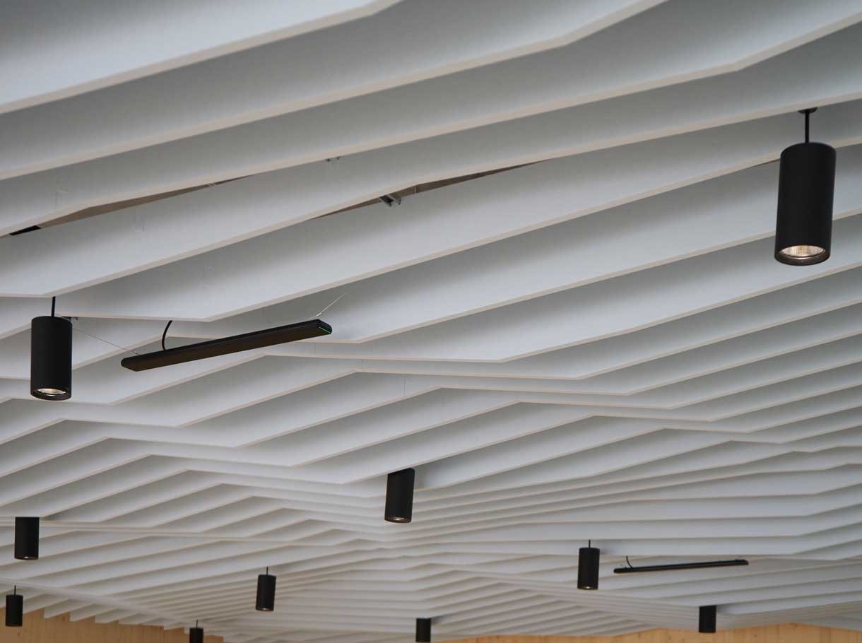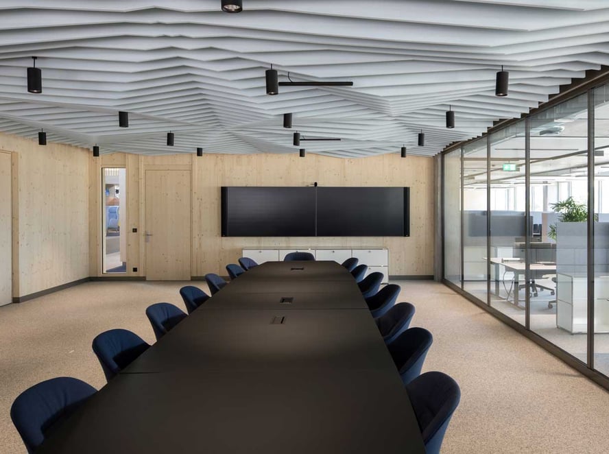 Im Boardroom befinden sich zwei 85 Zoll Displays für den Dual-Display-Betrieb. Das heisst, die extern Teilnehmenden und die präsentierten Inhalte lassen sich gleichzeitig problemlos darstellen. Die beiden Lautsprecher links und rechts der Displays, wurden so gestaltet, dass ihre Höhe exakt jener der Displays entspricht. Das Deckenmikrofon verfügt über Sensoren, die dafür sorgen, dass die Sprechenden klar und deutlich verstanden werden, egal wo sie sich im Raum befinden. Gleichzeitig werden störende Geräusche unterdrückt. Ganz nebenbei fügt es sich so gut in die kreative Decke ein, dass es kaum sichtbar ist. Die abgesetzte Kamera mit Speaker-Tracking-Funktion rundet diese hochwertige Installation ab.