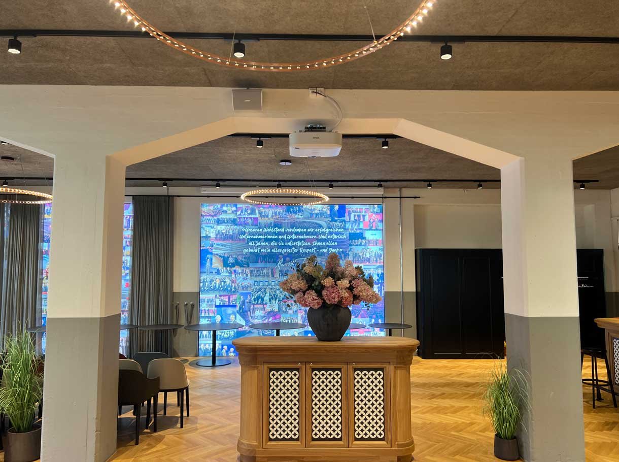 Die Eventhalle selbst bietet viel Tageslicht durch grosse Glasfronten und eine angenehme Raumakustik. Highlight ist der leistungsstarke Epson-Projektor mit 20’000 ANSI-Lumen, der brillante Bilder auf einer 5,75 x 3,6 m grossen Leinwand erzeugt. Zehn integrierte Lautsprecher sorgen für einen gleichmässigen Klang, auch bei Teilung des Raumes. Dank QSC Touchpanel kann der Raum flexibel in Zonen unterteilt und individuell beschallt werden – längs wie quer.