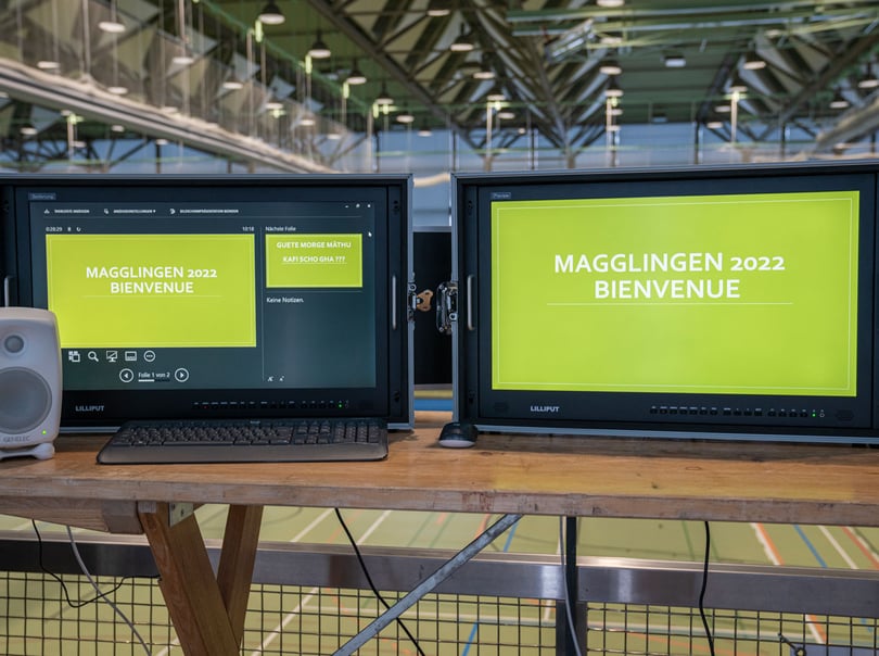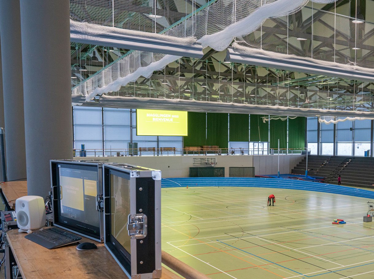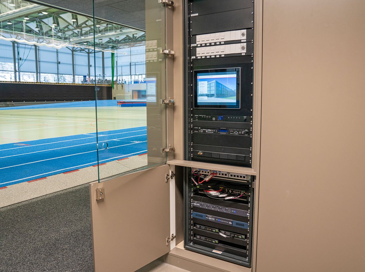 Auch die Regietechnik wurde erneuert und erweitert. Die fixe Regietechnik stellt mit ihrem AV over IP-Netzwerk die einwandfreie Anzeige während der Wettkämpfe sicher. Auf der Galerie kann eine mobile Regietechnik aufgebaut werden. Zudem wird die ganze Haustechnik der Halle, wie Storen, Licht und AV-Technik neu über ein AMX Touchpanel gesteuert. Nebst der LED-Wand durften wir auch die gesamte Beschallungsanlage erneuern. Des weiteren durften wir diverse Räume mit AV-Technik ausstatten. Im Kraftraum wurde ein 85“ Display sowie die Beschallungsanlage installiert. Der Seminarraum wurde mit einem Beamerlift, Leinwand, Lautsprecher sowie einer Hörunterstützungsanlage ausgestattet.