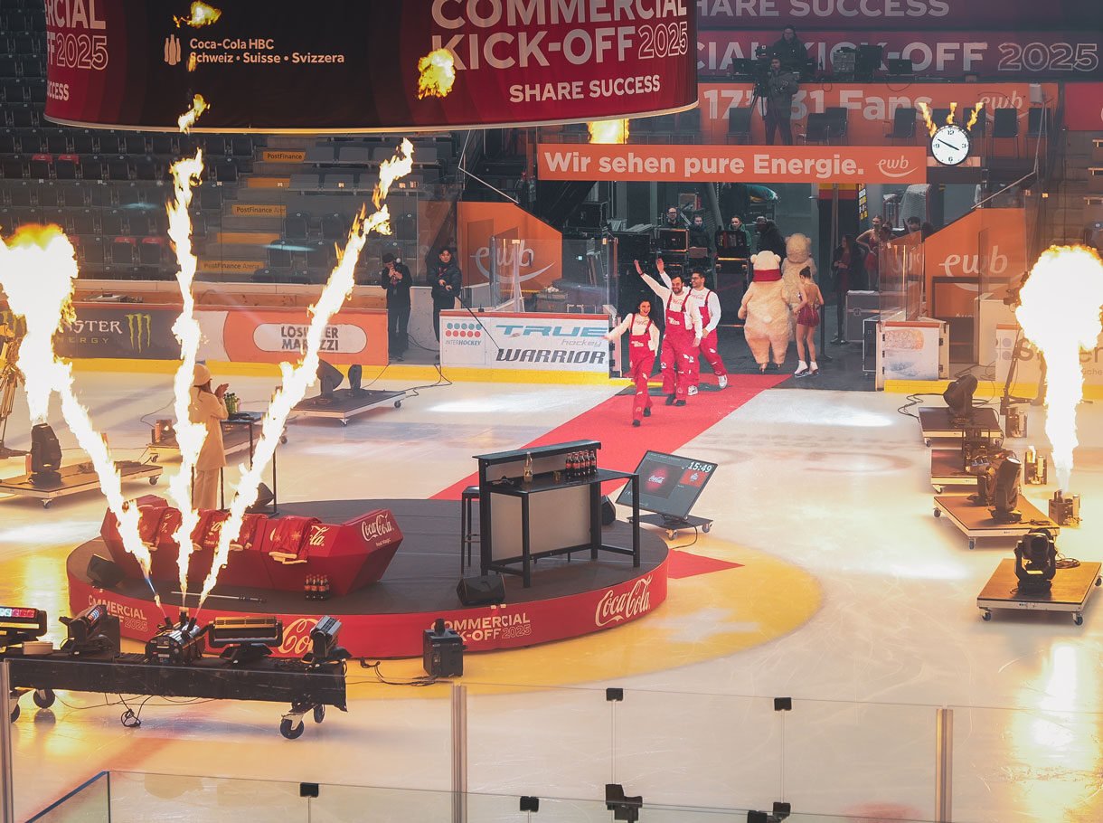 Für den jährlichen Coca-Cola Commercial Kick-Off durfte Kilchenmann eine massgeschneiderte Eventtechnik-Lösung in der VIP Lounge und auf dem Eisfeld der PostFinance Arena realisieren. In enger Zusammenarbeit mit dem Kunden, mit der Eventagentur Kesch und mit dem Gastgeber der Sportgastro AG, sorgte das Event-Team für eine reibungslose technische Umsetzung – von der technischen Planung bis zur Durchführung