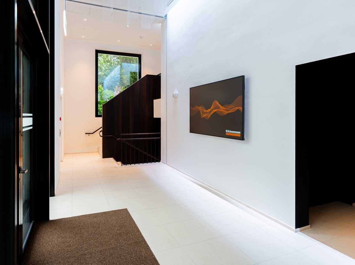Im Foyer informiert ein 86-Zoll NEC-Display über anstehende Events und bietet eine elegante Digital-Signage-Lösung für Gäste und Besucher.