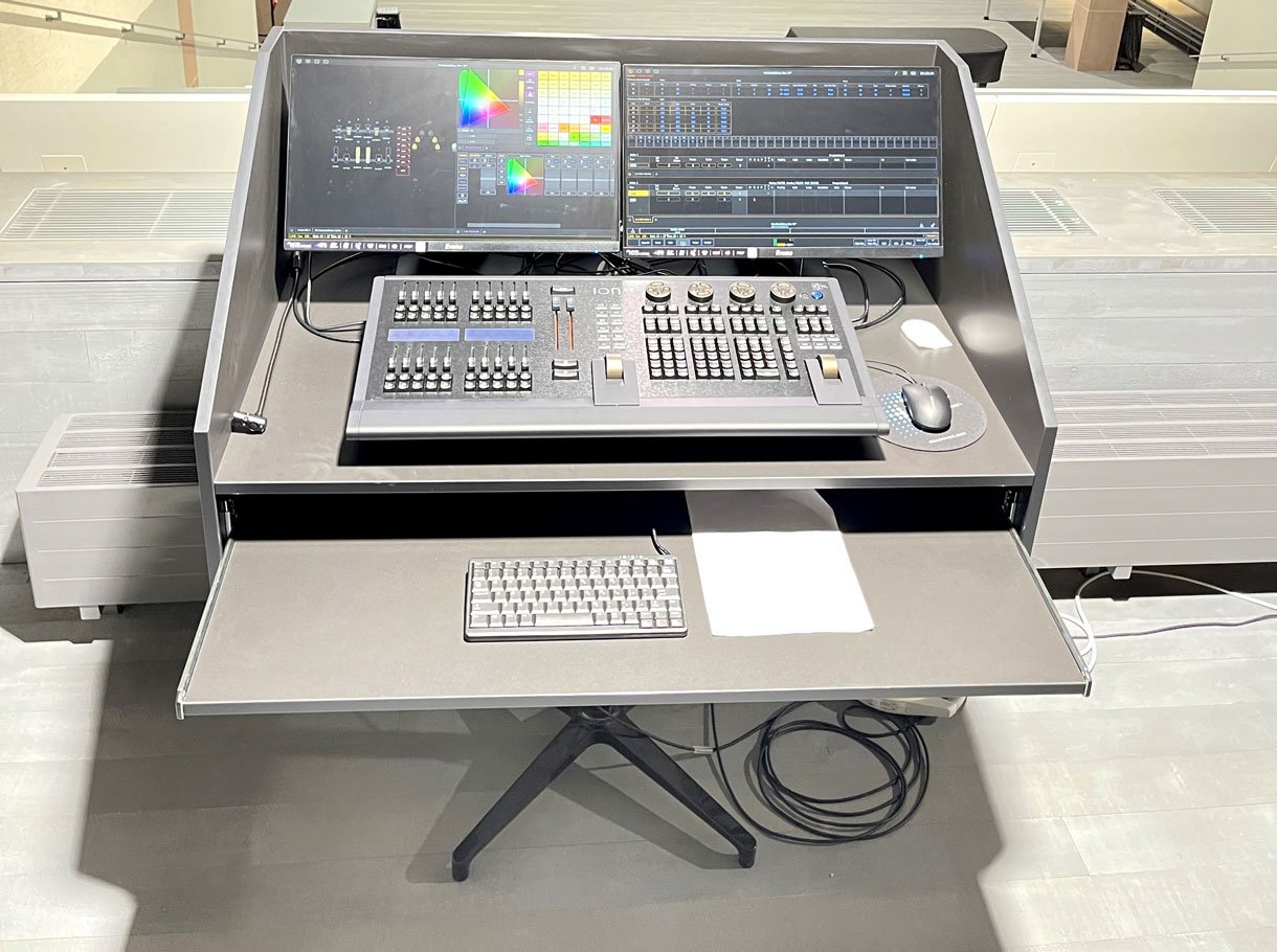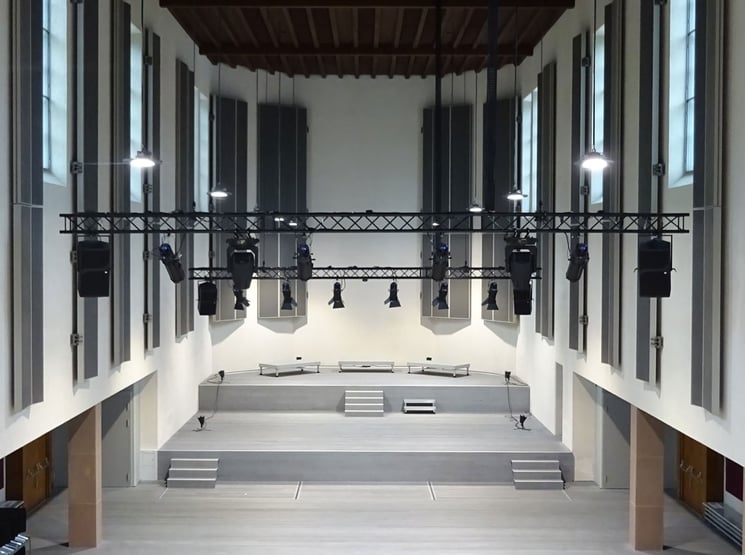 Im Bühnenbereich, im Parkett und auf der Empore wurden acht Anschlussstellen mit DMX, KNX, XLR, CAT.7, 230 V / T13 / 13A bestückt. Die Traversen wurden aus-gerüstet mit: CAT 5+7, DMX (Lichtsteuerung), Coaxkabel/BNC (Funk/Video), XLR für Hängemikrofone o.ä., T13 einzeln abgesichert 13A und diversen Scheinwerfern. Pro Traverse montierten wir zwei 1400W Lautsprecher, welche über Bluetooth und analoge Anschlüsse aktiviert werden können. Das Saallicht mit 14 Deckenstrahlern wurde in unser System eingebunden und kann via Lichtregiepult und mobilem Touchpanel für verschiedenste Szenen gesteuert werden. Eine 360° Kamera im Bühnenbereich übermittelt das Bild in die Regie. Eine Schwerhörigen-Anlage mit Induktionsschlaufe rundet die Installation ab.