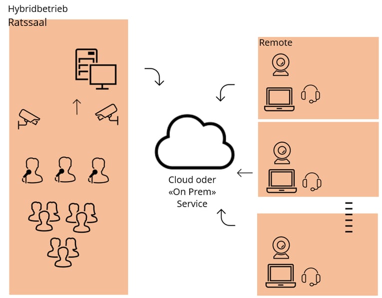 Die Verbindung zwischen dem Ratssaal, dem (Cloud-) Server und den Remote-Benutzern ist ein geschlossener Kreis. Es wird kein anderer Internetdienst, keine andere Verbindung oder keine weitere Schnittstelle verwendet.