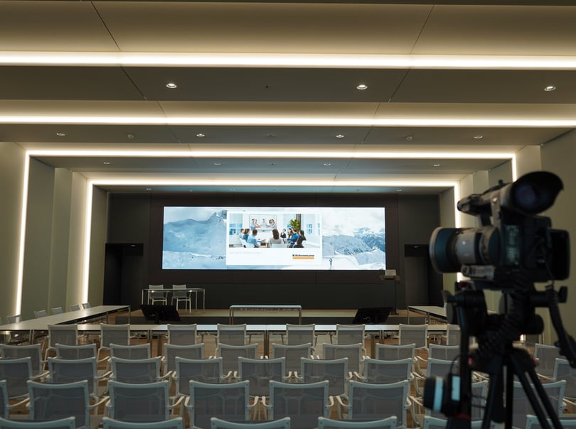 Kilchenmann zeichnet sich verantwortlich für die Planung und Integration der audiovisuellen Technik. Im Auditorium wurde frontseitig eine 8 Meter breite LED-Wand mit 1.5mm Pixel pitch von Samsung installiert. Präsentationen und übrige Contents lassen sich über diesen LED Screen individuell nach Bedarf platzieren. Zwei Vorschaumonitore auf Rädern unterstützen die Referenten. Für die Aufzeichnung der Events im Auditorium wurden zwei Kameras installiert.
