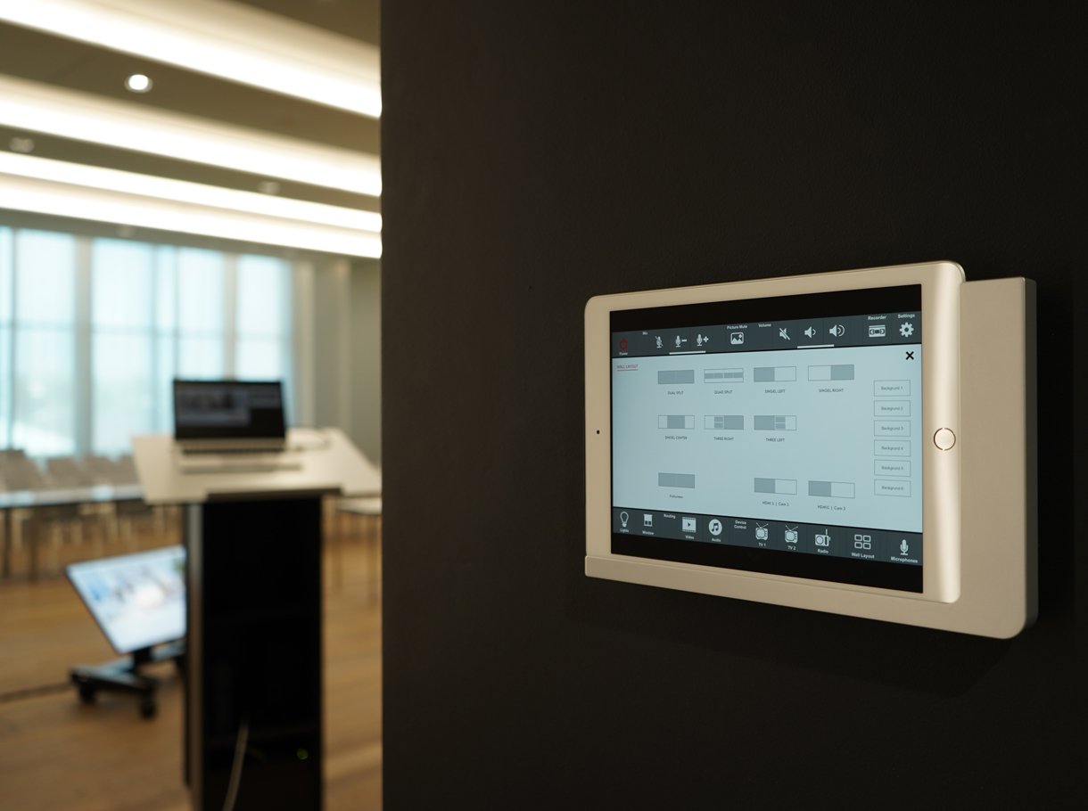 Als Signalmanagement wurden ein AV-Over IP System sowie eine auf Dante basierende Audio-Struktur gewählt. Dies bietet den Vorteil, dass zentral installierte Ressourcen wie Mikrofone etc. von sämtlichen über das Signalmanagement angeschlossenen Räumen aus angesteuert und genutzt werden können.