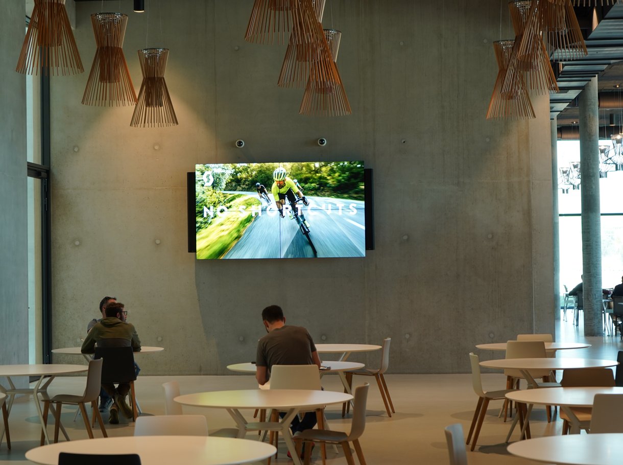 In der Cafeteria wurde eine 2x2 Displaywand inklusive Lautsprecher montiert. Der Content wird durch den Kunden selber ausgespielt. Auf diesen Displays können ebenfalls die gleichen Inhalte wie im Auditorium wiedergegeben werden.