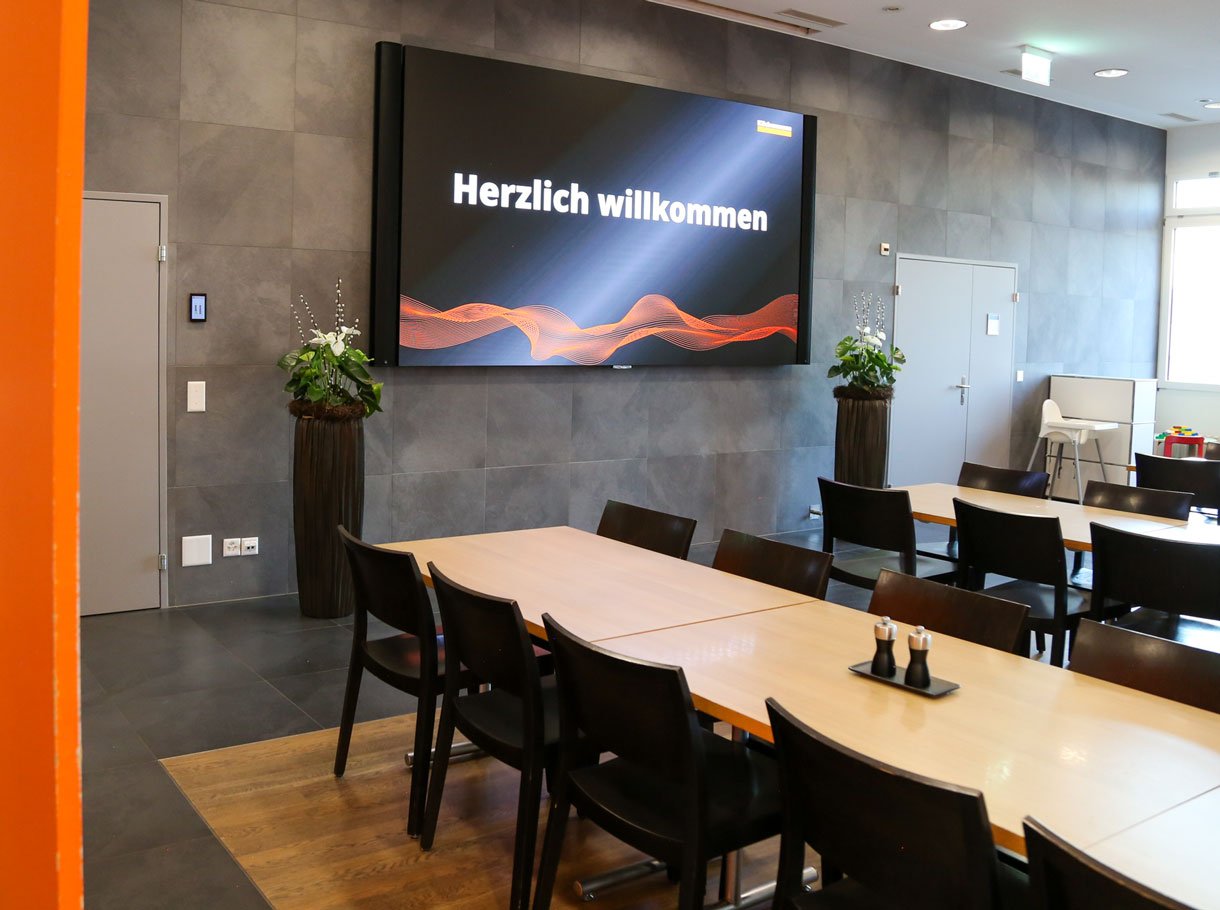 Für die Cafeteria, die sowohl für den regulären Betrieb als auch für Events und Vorträge genutzt wird, haben wir eine moderne Medientechniklösung umgesetzt.