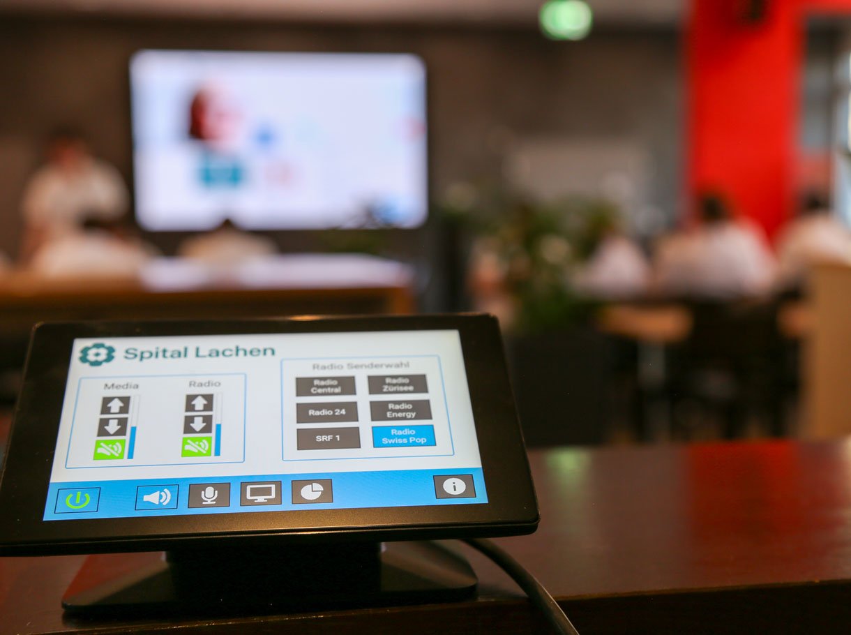 Die Steuerung erfolgt über zwei Touchpanels: In der Küche steht ein Panel zur Verfügung, mit dem sich Quellen umschalten, Lautstärken anpassen und voreingestellte Szenarien sowie Radiosender auswählen lassen. Ein weiteres, kleineres Touchpanel direkt bei der LED-Wall ermöglicht eine einfache Lautstärkeregelung im Raum.