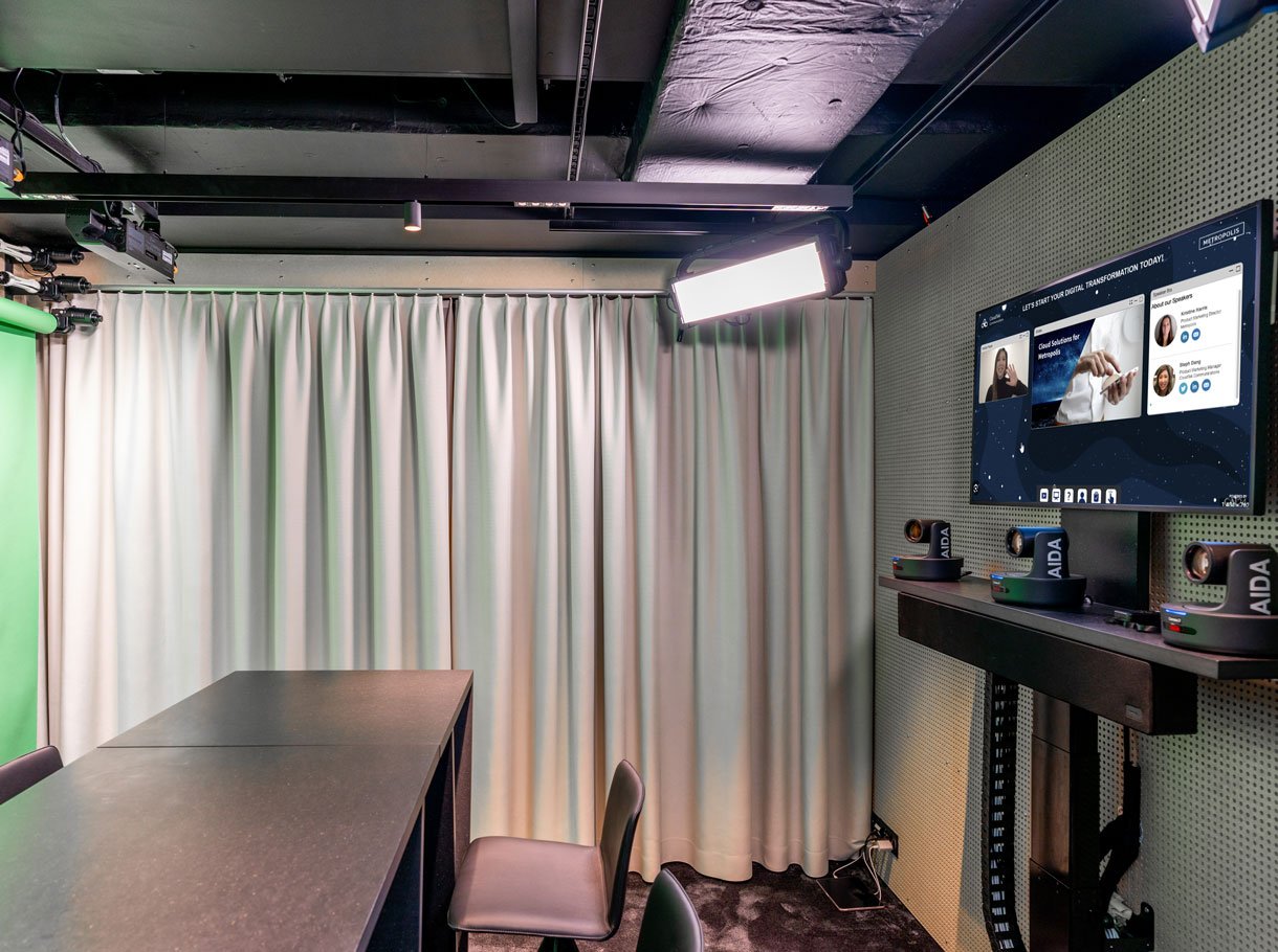 Das Studio selbst wurde mit einem 43 Zoll Display sowie drei PTZ-Kameras ausgestattet, welche an einem höhenverstellbaren Screen-Lift angebracht wurden. Damit die Kabel bei der Anpassung der Bildschirmposition unsichtbar bleiben, wurden diese innerhalb der Liftmechanik verlegt. Zudem wurden eine Soundbar, ein Deckenmikrofon und zwei Front- und drei Backlights installiert. Videokonferenzen / -Übertragungen können in hoher Qualität effizient und sicher mittels MTR erfolgen.