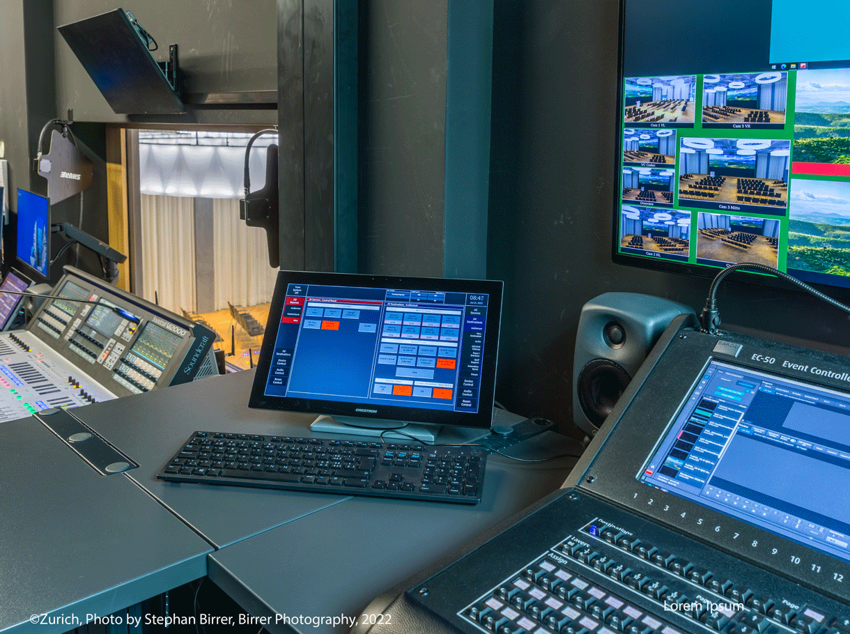 Die Regieräume wurden mit Ton-, Video- und Licht-Mischpulten sowie einer grossen AV-Matrix ausgestattet. Die Hauptregie bietet Platz für rund sechs Personen, namentlich Tontechniker*innen, Videotechniker*innen, PowerPoint Operator*innen und Lichttechniker*innen. In den Technikräumen finden sich fünf vollausgestattete 19-Zoll-Racks mit AV-Technik.