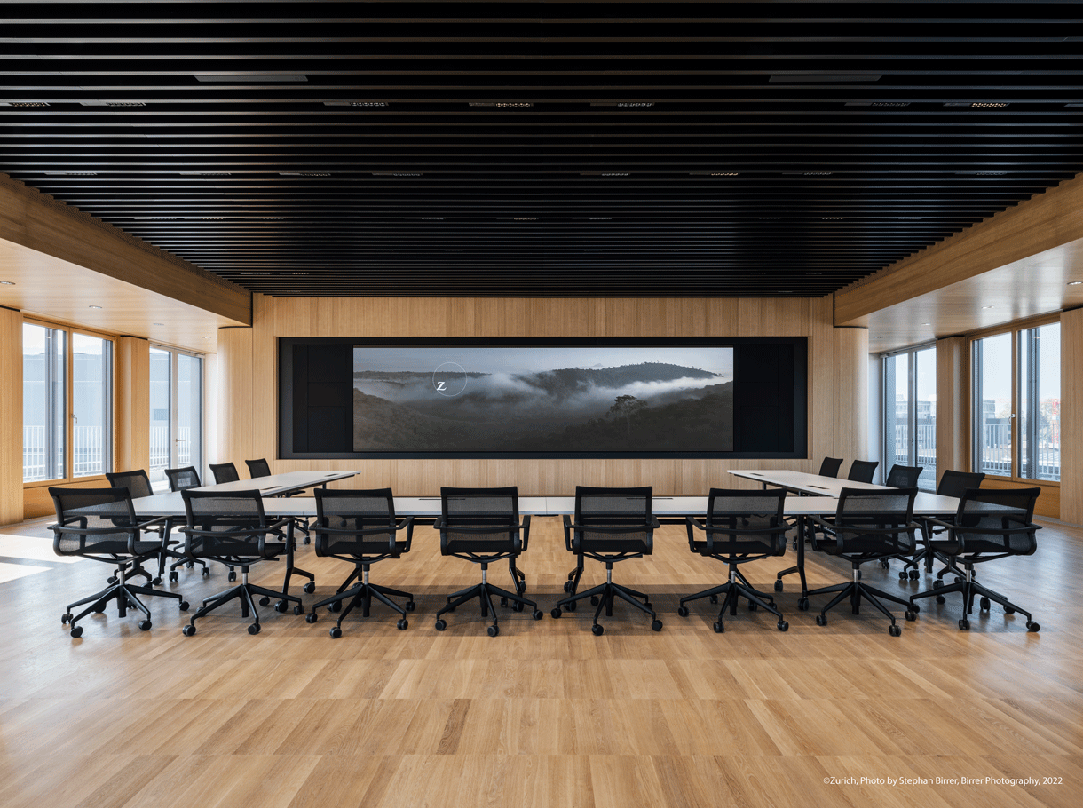 In diesem Meetingraum mit Seesicht wurde eine sechs Meter breite und fast zwei Meter hohe LED-Wand errichtet. Sie wurde von einem Holzkubus umschlossen, an welchem Line-Array-Lautsprecher sowie zwei Speaker-Tracking-Kameras so gut wie unsichtbar verbaut wurden. Bei einer Videokonferenz werden die Kameraverblendungen automatisch geöffnet und eine PTZ-Kamera wird aus der Decke heruntergefahren. Weiter wurden in die Decke sowie hinter Stoffblenden im Holzkubus auch Array-Mikrofone verbaut. Als Unterstützung für die Redner*innen wurden ausserdem Referentenmonitore eingebaut und das durch einen Medienmöbel-Spezialisten angefertigte Rednerpult wurde mit Übertragungstechnik ausgerüstet. Nicht zuletzt wurden im ganzen Raum ein Wireless-Präsentationssystem, Tischeinbaudosen für Strom und USB-Anschlüsse sowie ein AV-over-IP-Transmitter eingebaut – alles Features, die bei Kilchenmann zur Standardausstattung gehören.